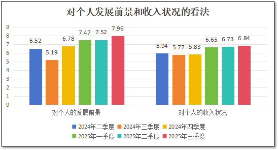 此外,在本次统计调查中,检验检测从业者们对“本人在业内的发展前景信心”这一指标打出的分值为7.96分,同样超越了今年二季度的分值,再创6个季度以来的最高分,但比同期从业者们对检验检测行业整体的发展信心值8.27分要低,这说明从业者们尽管认为行业会向好发展,但对自身在业内的发展前景信心度略低。而对于个人的收入状况满意度的这一指标的看法,2025年3季度末得分为6.84分,也是6个季度以来的最高分,说明随着对行业发展预期的提升,从业者们认为自身的收入状况也会水涨船高。