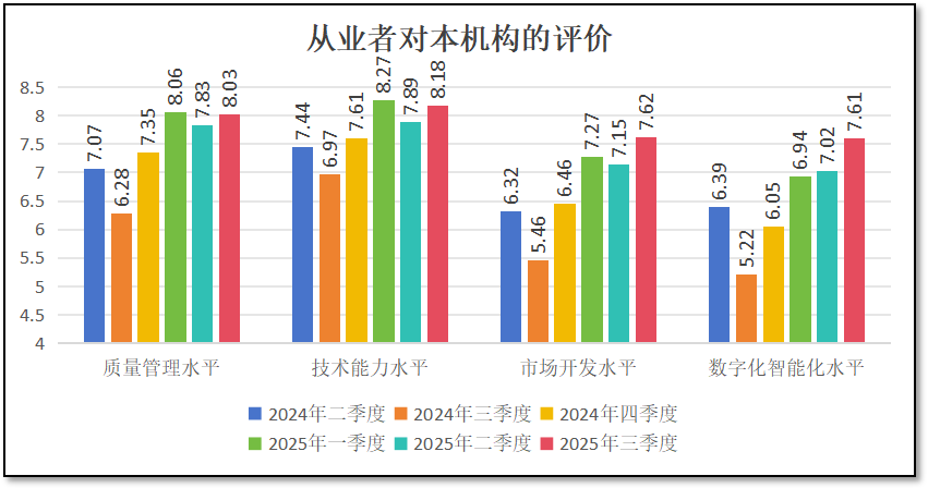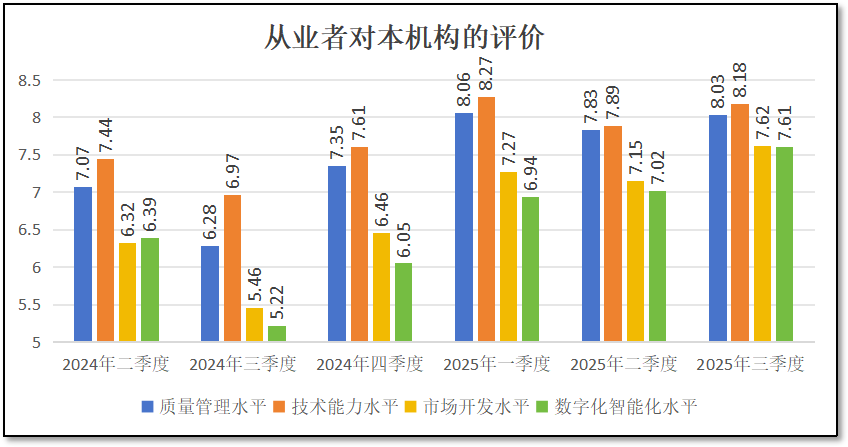 由上两图可见,在三季度末,从业者们对本机构的“质量管理水平”打分为8.03分,对“技术能力水平”打分为8.18分,对“市场开发水平”打分7.62分,对“数字化智能化水平”打分为7.61分。从这些数据来看,四个指标均较二季度出现增长,说明从业者们认为本机构的质量管理、技术能力、市场水平以及数字化水平均有一定改善。但“质量管理水平”和“技术能力水平”两个指标的得分仍低于今年一季度,说明检验检测机构普遍在下半年加大了市场经营和数字化改造方面的投入,且取得了实效。但由于对自身质量管理和检验检测技术能力比较有信心,且可能这方面投入不会直接提升业务收益,因此着力不多,得分没有明显增长,从长远看可能发展后劲会受到制约。