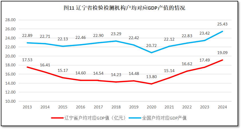 由图12可见,过去12年,辽宁省检验检测机构户均对应的人口数量变化规律与全国的情况相似,都是逐年下降的趋势,但具体数值上辽宁省都比全国平均数要低。辽宁省检验检测机构从2013年的户均对应3.98万人,下降到2024年的2.43万人左右。从人口数量的对比值来看,辽宁省检验检测机构数量显得过多,从户均对应GDP值看,也显得过剩。这说明辽宁省尽管经济降速,人口数量也在减少,但由于检验检测行业存量规模较大,与辽宁省经济总量和人口总量相比仍显过剩,行业结构性调整仍然需要持续深化。虽然2024年度情况有所好转,但市场发展环境和增长空间仍然有限,改革仍在路上。