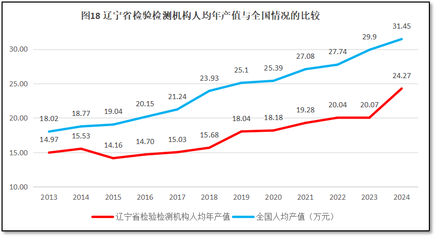 辽宁省检验检测机构人均年产值与全国的情况比较如图18所示。